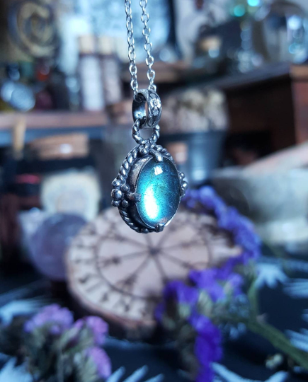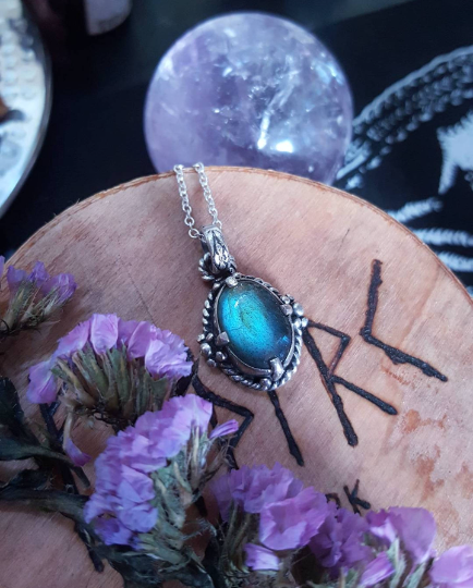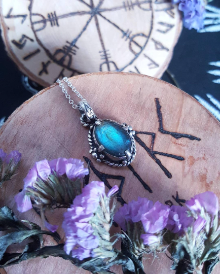 This Medieval inspiration pendant is made from sterling silver and ornamented with a sublime and flashy Labradorite.
