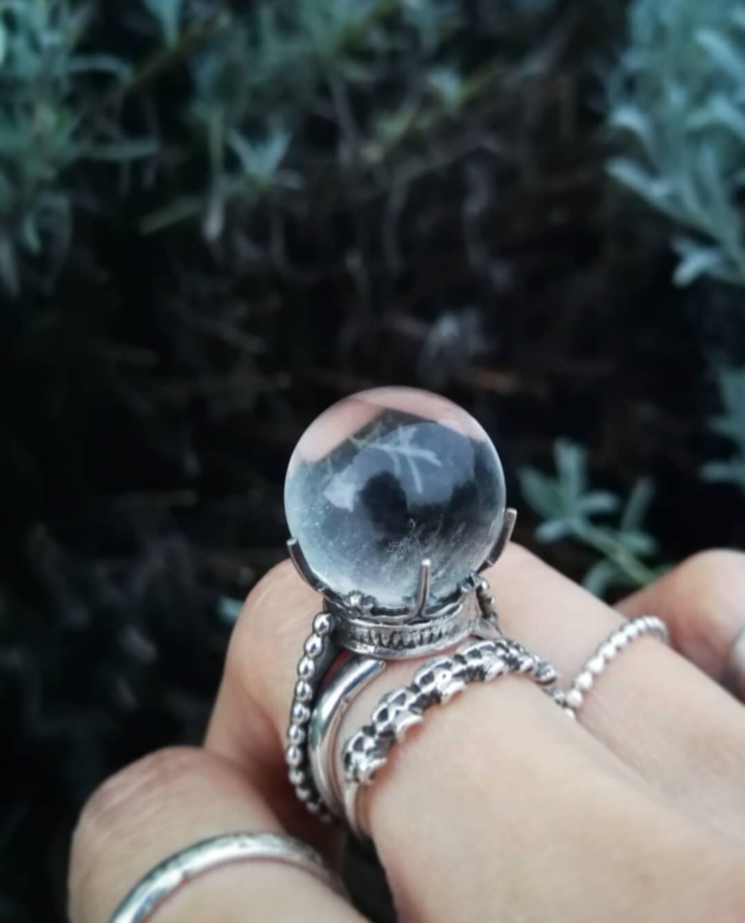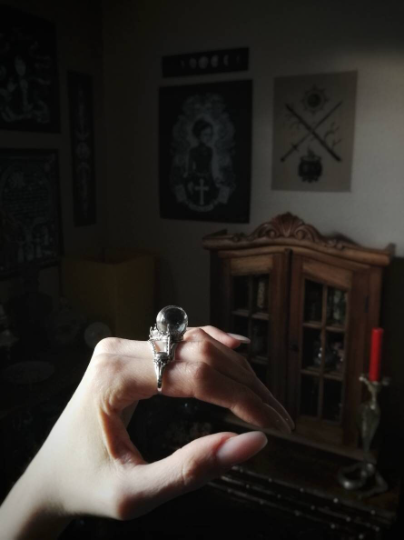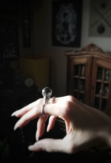 Sterling silver ring symbolizing the psychic power, ancient knowledge and divinatory practice, ornamented with a Quartz crystal ball.
