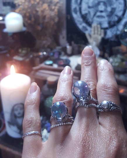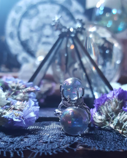 Bague symbolisant le pouvoir psychique, le savoir ancien et la pratique de la divination en argent sterling, ornée d'une boule de cristal en Quartz Aura.